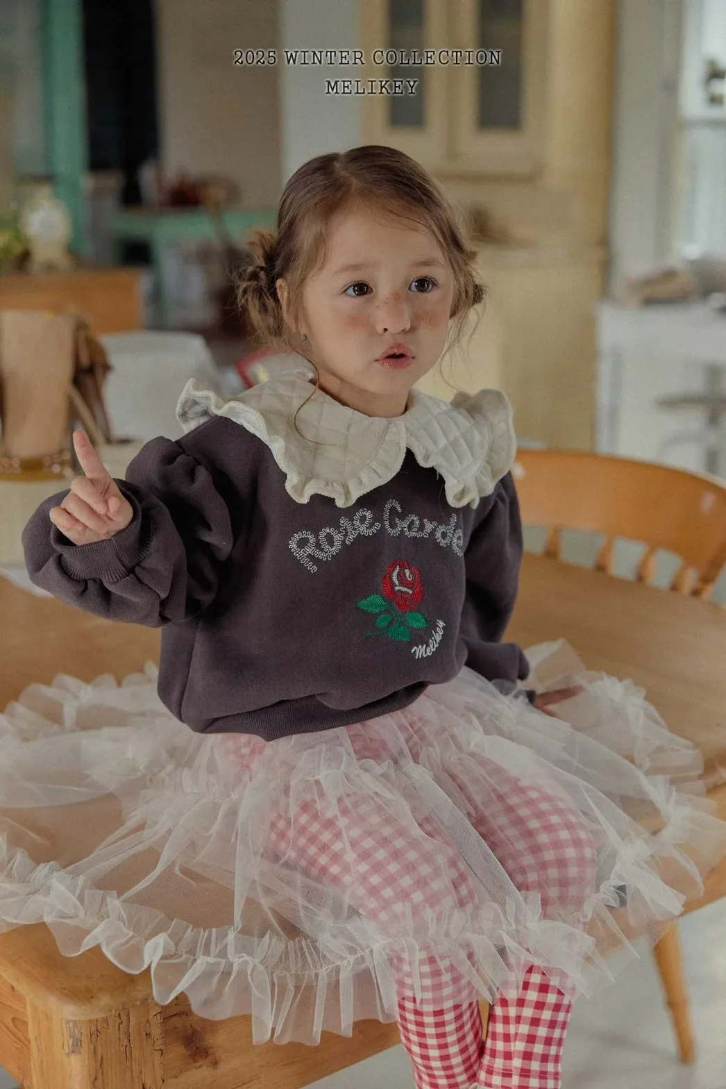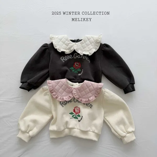 2025.melikey家-拼接荷葉領玫瑰刺繡上衣
